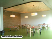 Wandverkleidung und Deckensegel aus schallabsorbierenden Akustikplatten in Weisstanne.